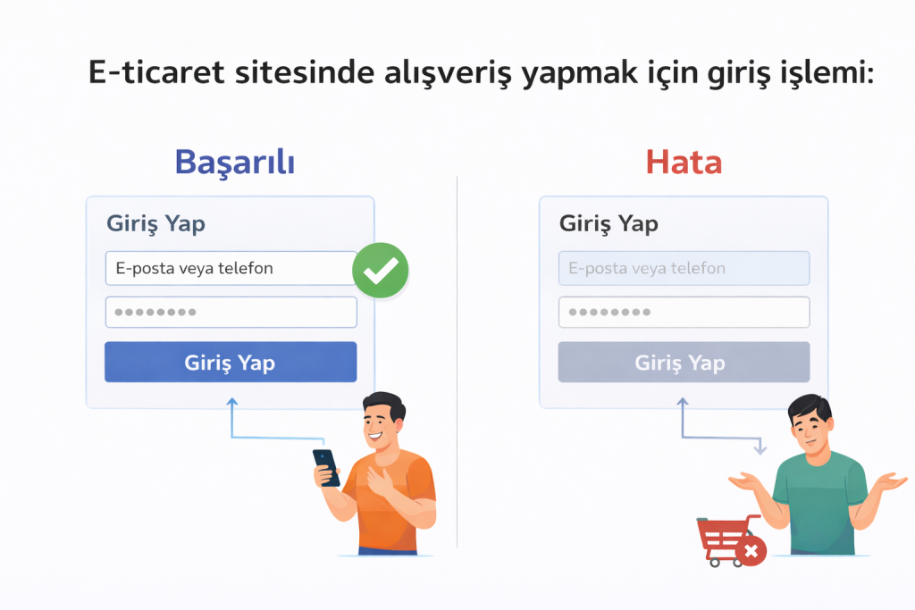 Örneğin bir e-ticaret sitesinde gezinirken birkaç ürün beğendiğimizi ve satın almak istediğimizi düşünelim. Alışverişi tamamlayabilmek için sistem, kullanıcıdan giriş yapmasını; üye değilse üyelik oluşturmasını talep eder. Kullanıcının daha önce üye olduğunu varsayarsak; kullanıcı adı/e-posta/telefon ve şifre bilgileri girildikten sonra “Giriş Yap” butonuna basıldığında (doğru bilgi girilmişse) beklenti, giriş işleminin başarıyla tamamlanmasıdır (happy path). Ancak “Giriş Yap” butonunun çalışmaması veya alanların pasif olması gibi bir durum söz konusuysa kullanıcı giriş yapamaz ve alışveriş sürecine devam edemez.