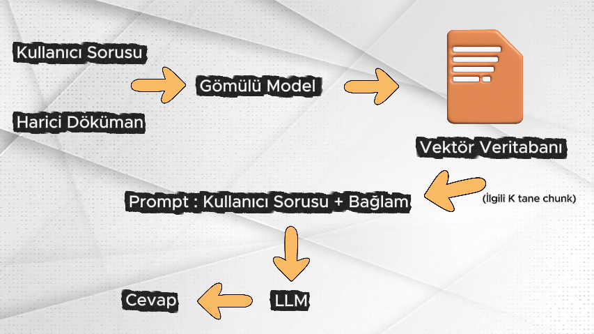 Bu aşamaya kadar, dış kaynak olarak kullanılan dokümanlar chunk’lara bölünmüş ve her bir chunk bir embedding (gömme) modeli aracılığıyla vektör temsiline dönüştürülerek vektör veritabanında saklanmıştır. Bu noktadan sonra sistem, harici dokümanlarda yer alan bilgilere ilişkin soruları yanıtlayabilecek duruma gelir.